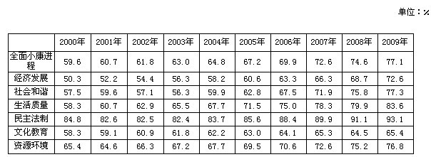 表1:2000~2009年我国全面建设小康社会及在六大方面实现程度