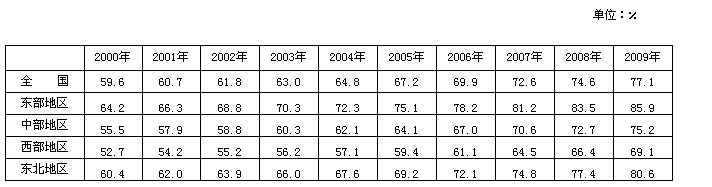 表2:2000~2009年全国及四大区域全面建设小康社会实现程度