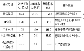 网络广播影视。指采用IP协议、通过互联网传输数据、以个人电脑为终端的音视频传播业务,主要包括狭义的网络广播、网络电视、网络电影,以及音视频分享网站(播客)、音视频搜索、P2P视频服务等。目前,中国的网络广播还未形成比较成熟的盈利模式,而网络视频则在近几年保持良好发展态势。2010年中国网络视频广告收入在20亿元左右,而网络视频的用户人数则达到2.84亿,已经成为世界上最大的单一国家视频用户群体。
