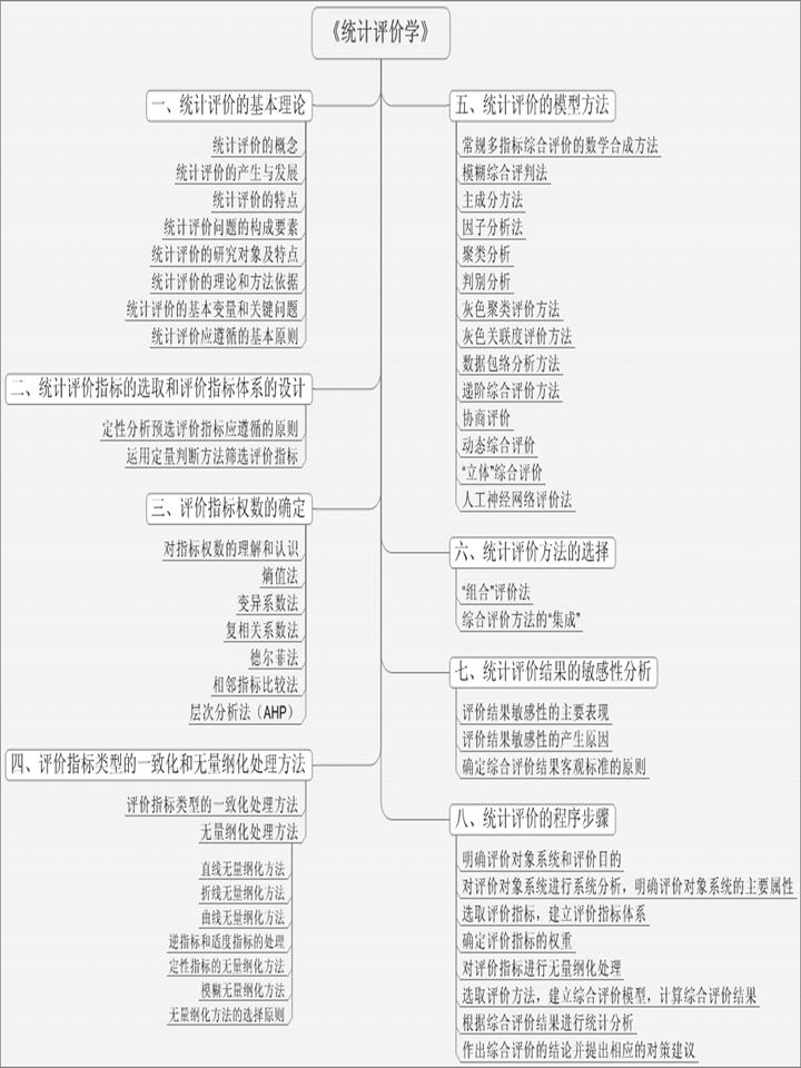 《统计评价学》要成为一门学科,必须分析其产生和发展的历程,明确其概念、特点、研究对象、构成要素等理论问题,建立相应的理论体系;统计评价的关键是运用适当的统计方法作为评价的模型方法,统计评价的模型方法很多,对不同的对象进行评价必须选择与其特点相适应的评价方法,为此必须从系统的角度建立能够适应不同评价对象特点、相对完整的评价方法体系;另外,统计评价又是一门应用性很强的学科,需要运用大量的实证分析案例进行佐证,并对评价过程的基本步骤和评价结果分析方法进行规范。基于上述认识,对《统计评价学》基本框架体系初步设想如下: