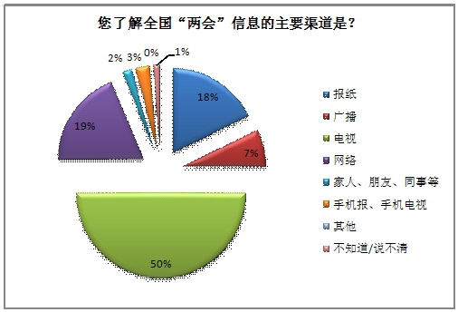 调查中,受访者主要通过电视媒体了解“两会”信息,比例达到49.82%,其次为网络(18.91%)、报纸(17.82%)和广播(7.27%)等。