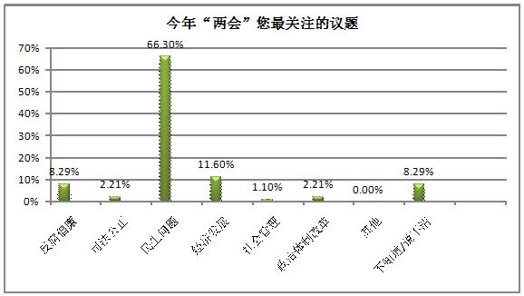 “两会”上,代表、委员们情系民生,发扬民主,提出了560多件议案和5762件提案。在“两会”诸多议题中,公众最关注的议题依次是民生问题(比例为66.30%),经济发展(11.60%)、反腐倡廉(8.29%)等。
