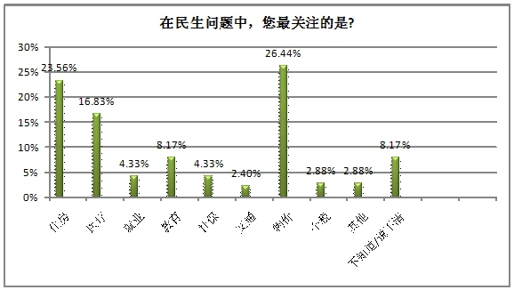 公众最关心的民生问题依次是物价(26.44%)、住房(23.56%)、医疗(16.83%)、教育(8.17%)等。