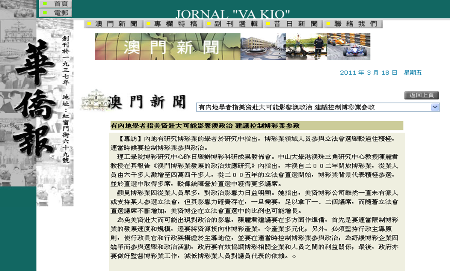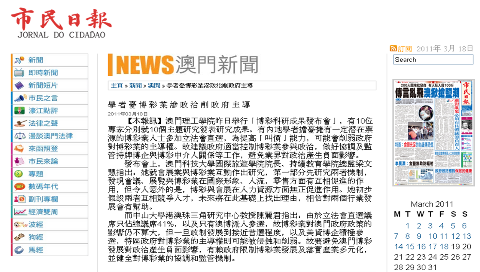 澳门博彩业的政治及社会效应议题也引来媒体的特别关注。港澳珠江三角洲研究中心陈丽君教授在其报告《澳门博彩业发展的政治效应研究》中指出,澳门自2002年开放博彩业,从业人员由六千多人激增至四万四千多人。因从业人员多,博彩行业对政治的影响力日益明显。为避免美资壮大可能对政治的影响,陈丽君教授建议在多方面作出准备,包括适当控制博彩业的发展速度和规模,坚持行政主导原则,有效协调博彩企业及人员之间的利益关系,以及做好博彩行业监管工作等等。刘祖云教授则在《澳门博彩业的社会效应研究》中探讨了澳门博彩业对社会发展的作用以及澳门博彩业引发的社会问题,指出博彩业的相关机制和制度给澳门社会秩序的维持带来挑战。“一业独大”的产业结构会带来许多经济和社会问题。而博彩业的“高经济收入、低学历要求”会妨碍人口整体素质的提高;而博彩从业者的较高收入会加剧社会的贫富分化。并探讨了发展澳门博彩业的有关对策。
