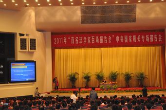 在国家“十二五”规划实施的第一年,“六五”普法起步之年,中国社会主义法律体系形成之年,由中组部、中宣部、中政委、教育部、司法部、中国法学会等“百名法学家百场报告会”法治宣讲活动(简称“双百”活动)组委会会同中直机关工委、中央国家机关工委、解放军总政治部以及北京市委共同举办的2011年“双百”活动中央国家机关专场报告会5月5日在人民大会堂举行。西北政法大学校长贾宇教授作了题为“社会管理创新与法治保障”的报告。报告会由中央政法委副秘书长鲍绍坤,“双百”活动组委会副主任、司法部副部长张苏军共同主持。这场报告会是2011年“双百”活动的首场报告会,标志着年度“双百”活动正式拉开帷幕。
