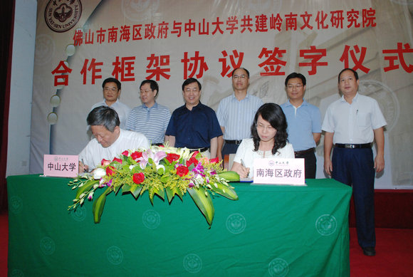 6月7日下午,中山大学与佛山市南海区政府签订共建岭南文化研究院合作协议在怀士堂举行。中山大学许宁生校长、陈春声副校长及有关文科教授代表,南海区邓伟根书记、俞进副区长等有关领导出席了签字仪式。 中山大学岭南文化研究院定址于西樵山三湖书院,通过双方共建合作,深入挖掘和广泛弘扬岭南文化。研究院将秉持高水平、国际化、开放式的发展定位,集科学研究、教学、学术交流、服务地方为一体,力争建设成为在国际上有较大影响的岭南文化研究中心、资料信息中心、学术交流中心、人才培养基地。