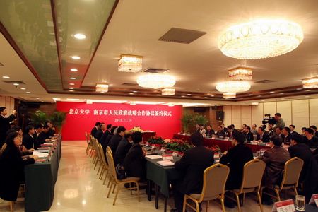 11月14日,北京大学、南京市战略合作协议签约仪式在北京大学英杰交流中心举行。江苏省委常委、南京市委书记杨卫泽,南京市委副书记、市长季建业率南京市党政代表团访问北大,北京大学党委书记朱善璐,党委常务副书记、副校长张彦,常务副校长吴志攀,党委副书记杨河,党委副书记、纪委书记于鸿君,党委副书记、医学部党委书记敖英芳,副校长鞠传进、王恩哥,研究生院院长陈十一,校长助理邓娅、程旭、马化祥、教师代表及相关职能部门负责人出席签约仪式。仪式由张彦主持。
