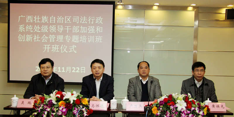 11月22日上午,由中国政法大学高级政法管理干部进修中心承办的广西壮族自治区司法行政系统处级领导干部加强和创新社会管理专题培训班在中国政法大学国际交流中心举行。广西壮族自治区司法厅副厅长卢万兵、中国政法大学副校长马怀德、广西壮族自治区司法厅法制宣传处处长黄焕光、中国政法大学高级政法管理干部进修中心副主任黄娟出席了开班仪式。中国政法大学高级政法管理干部进修中心常务副主任吴飚主持了开班仪式。