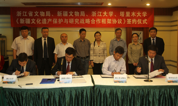 5月7日上午,浙江大学副校长罗卫东与新疆维吾尔自治区文物局局长盛春寿、浙江省文物局副局长陈官忠、塔里木大学校长王合理在乌鲁木齐共同签订《新疆文化遗产保护与研究战略合作框架协议》,四方将充分发挥文物资源、人才资源、科技研究资源等各自优势,围绕新疆文物保护工作和浙江大学与塔里木大学相关学科建设需要,联合开展多层次的科学研究、技术交流与人才培养,为新疆文化遗产保护与研究工作提供支撑。