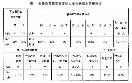 任职前的工作经验是校长职业化的重要基矗调查表明,现任的75所大学校长中,67%的大学校长担任过部属高校副校长或普通高校校长等职务,其中84%的校长具有教育行政管理经验;13.3%的校长是从其他部属高校平行调动。而且,如表1所示:大部分校长的工作经历都非常丰富,通常都具备了行政管理与高校教学或科研的经历。多样化的职业背景有利于大学校长的职业化进程。