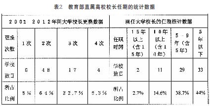 任期是校长职业化的重要标志。调查表明,75所部属院校在2002—2012年间校长的更换频次平均为2.26次,83%的高校在这10年间更换过校长,仅6所高校10年内没有更换过校长,他们是中南财经政法大学、中国药科大学、华北电力大学、东华大学、中央美术学院、中央音乐学院。4所大学更换次数比较频繁,他们是吉林大学、武汉大学、中国地质大学(北京)、湖南大学,10年内更换了4次。部直属高校大学校长的平均任期为5.7年,大部分大学校长任期在5年以下,其中最长任期为16年的有2位:中央美术学院的院长自1996年至今,已在现学校任职16年,东北大学前任校长自1995到2011年任职16年。任期最短的是武汉大学校长,2008年上任到2010年结束,为期2年(书记改校长)。