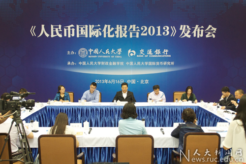 6月16日上午,中国人民大学国际货币研究所发布《人民币国际化报告2013》。中国人民大学校长、中国人民银行货币政策委员会委员、报告主编陈雨露教授在报告解读中提出,当前人民币国际化进程处于高速增长阶段,但国际使用仍处于起步阶段,对此,应增强人民币贸易计价功能,通过巩固贸易地位以稳步提高人民币国际化指数。