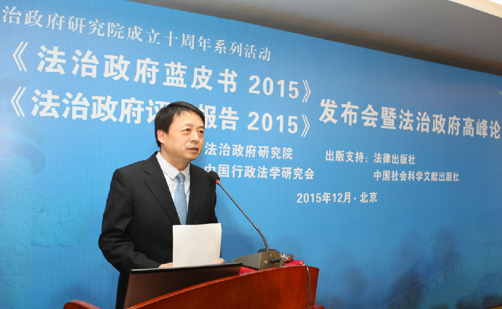 为贯彻党的十八届五中全会强调的坚持依法治国原则,如期实现建成小康社会奋斗目标,推动经济社会持续健康发展。中国政法大学法治政府研究院于12月14日召开《法治政府蓝皮书2015》、《法治政府评估报告2015》发布会暨法治政府高峰论坛。中国政法大学副校长兼中国行政法学研究会会长马怀德出席论坛并发布《法治政府蓝皮书2015》,中国政法大学终身教授应松年、社会科学文献出版社总编杨群和中国法学会研究部主任李仕春出席会议并致辞,中国政法大学法治政府研究院副院长王敬波及“中国法治政府评估”项目组成员做评估报告,11位地方政府法制办的相关负责人,检察院、法院等部门负责人和兄弟院校科研单位的专家学者受邀参加高峰论坛。发布会由中国政法大学法学院院长薛刚凌主持。