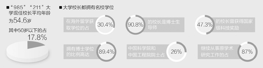大学校长都拥有名校学位,在海外留学获取学位的占30.4%,拥有博士学位的比例高达89.4%,90.8%的校长是博士生导师,中国科学院和中国工程院院士占26%。63%的大学校长理工科出身,其中管理学背景的校长占10.9%,教育学背景的校长仅占4.3%。校长所在学科位列国务院学位委员会学科排行榜中的平均位次为17位,他们大部分是校内和学科领域的权威,47.3%的校长曾获得国家级科技奖励。