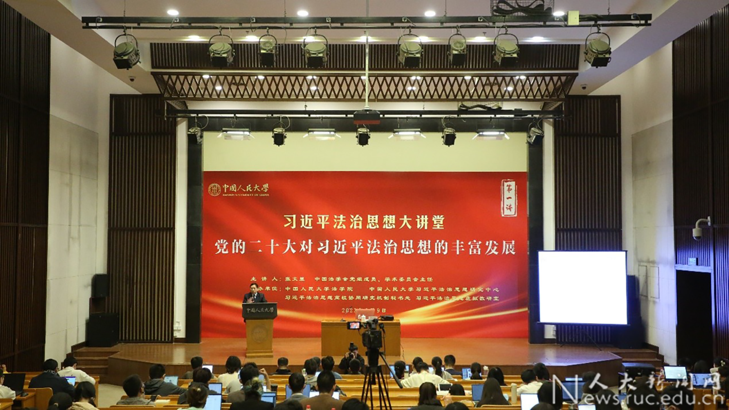 3月9日,由中国人民大学法学院、中国人民大学习近平法治思想研究中心、习近平法治思想高校协同研究机制秘书处、习近平法治思想虚拟教研室共同主办的“习近平法治思想大讲堂”首场报告会在中国人民大学国学馆报告厅举行。中国法学会党组成员、学术委员会主任、教育部社会科学委员会法学学部召集人、习近平法治思想研究高校协同研究机制召集人、党的二十大代表张文显教授,应邀作了题为“党的二十大对习近平法治思想的丰富发展”的演讲。